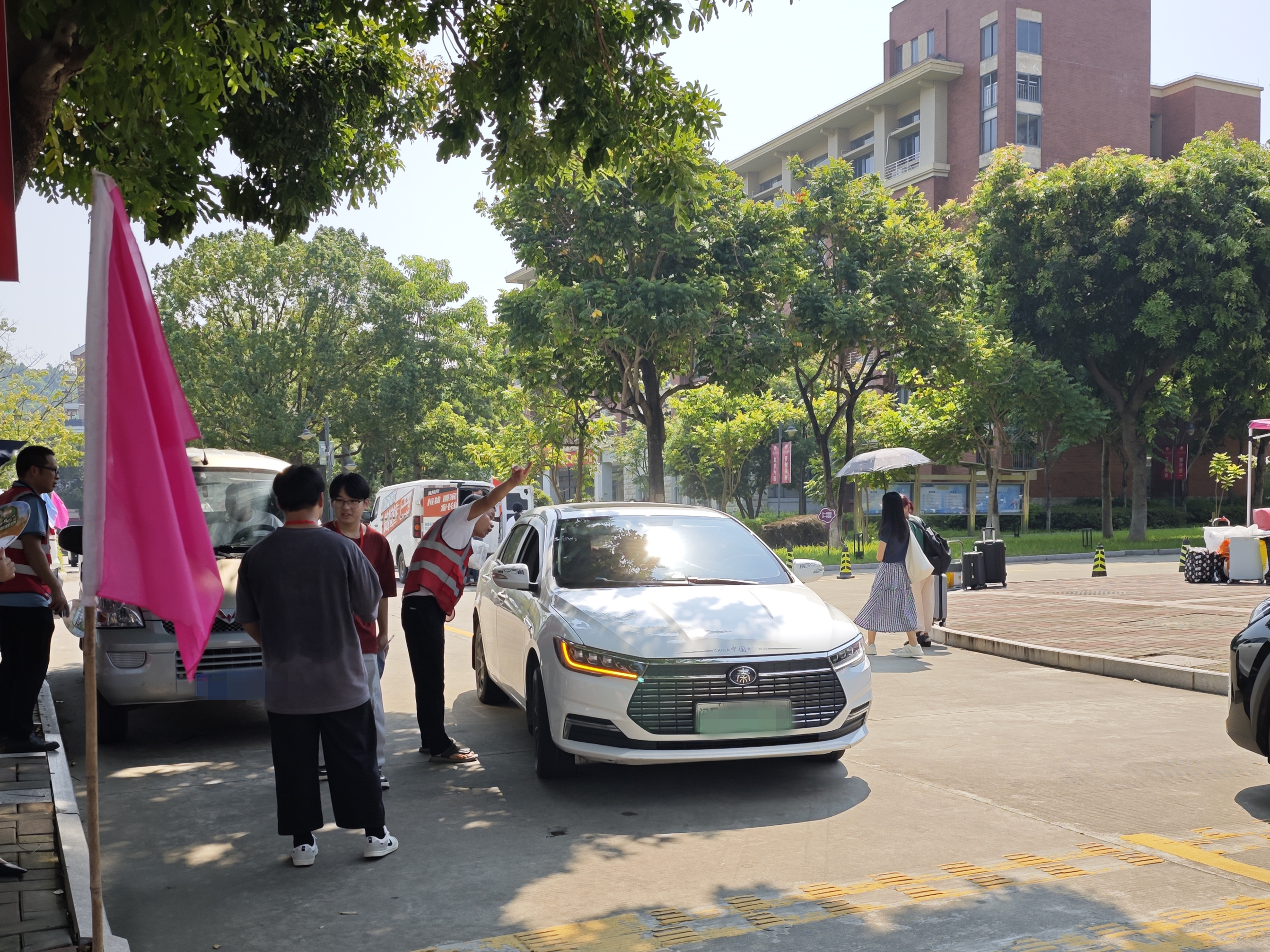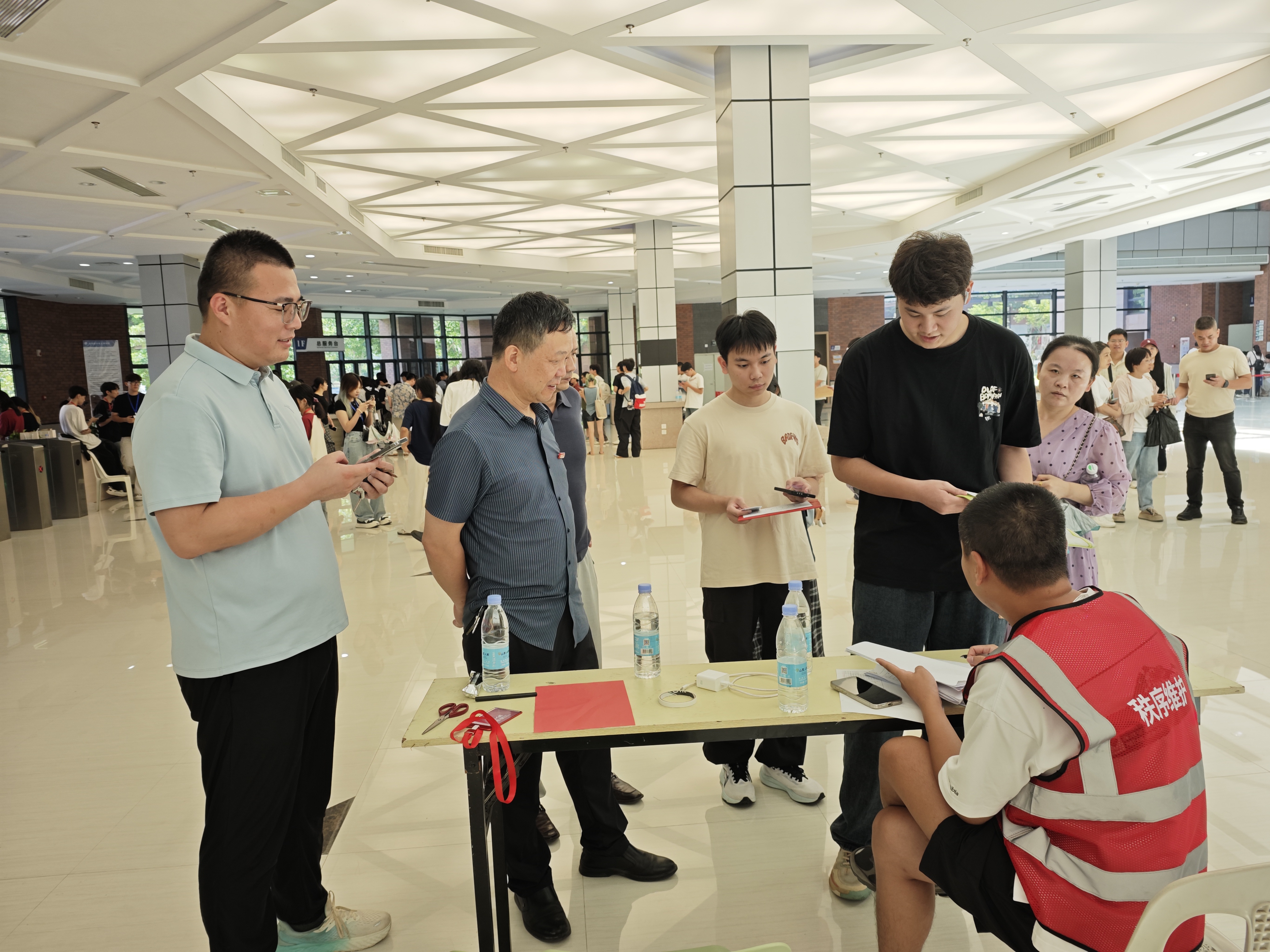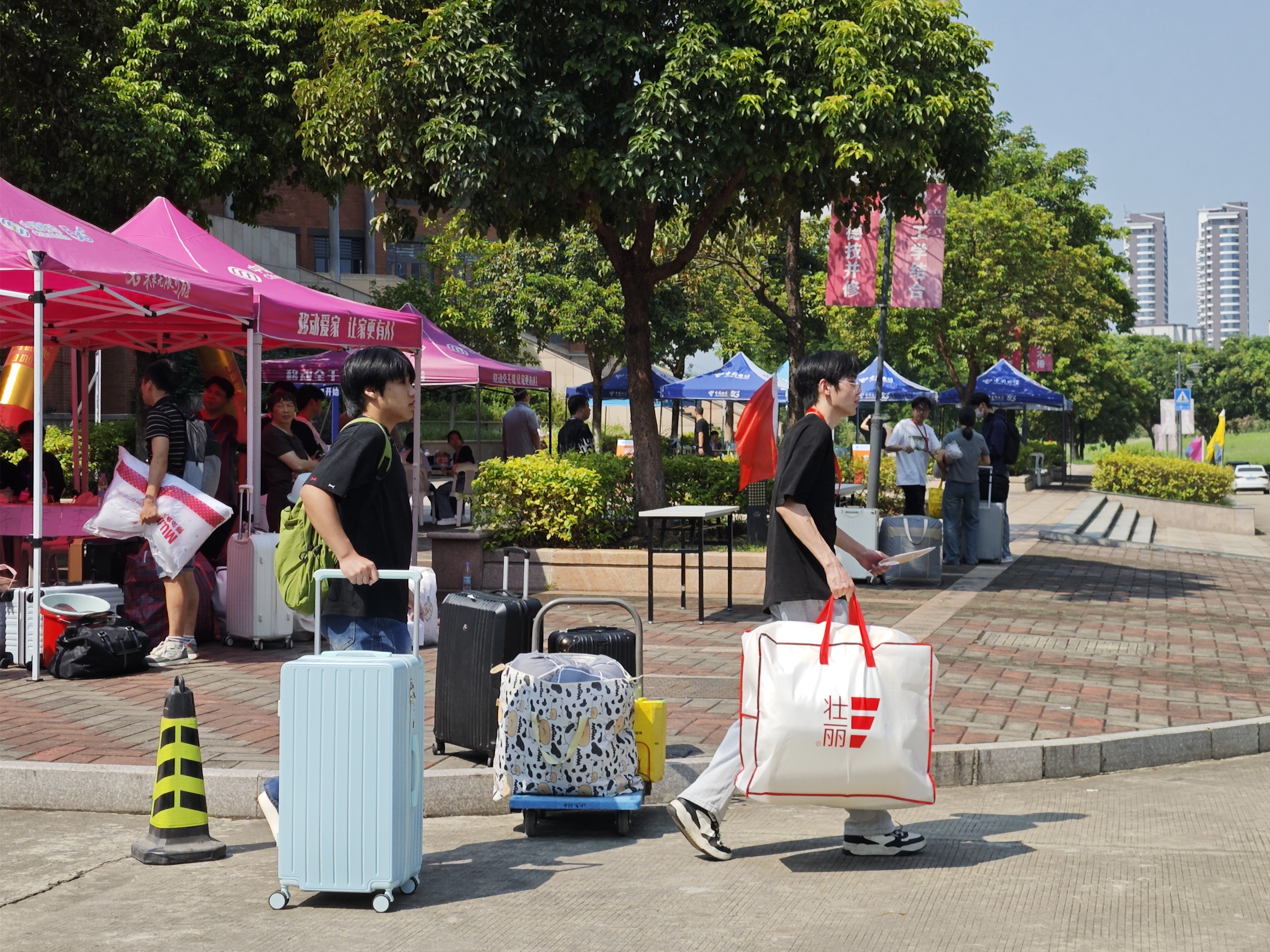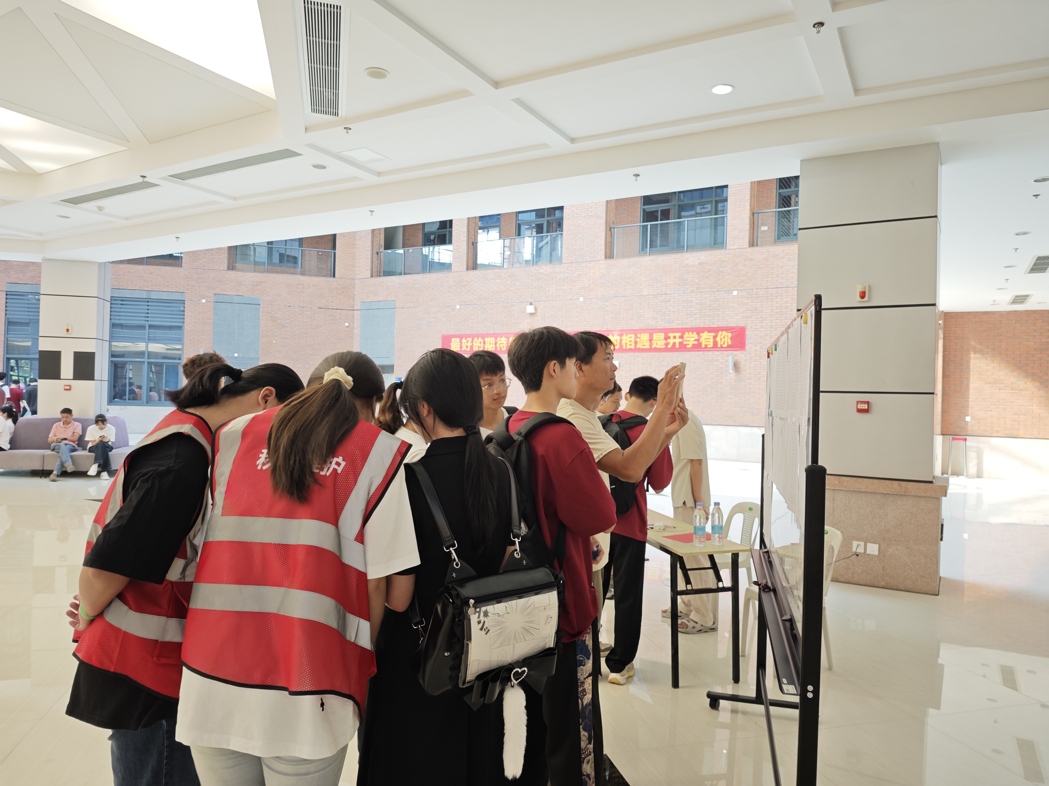 “同学,跟我来,往这走”,校园里,处处可以看见志愿者们忙碌的身影,他们主动接过新生手中的行李,耐心引导,配合现场工作人员完成入学报到,为新生们保驾护航。