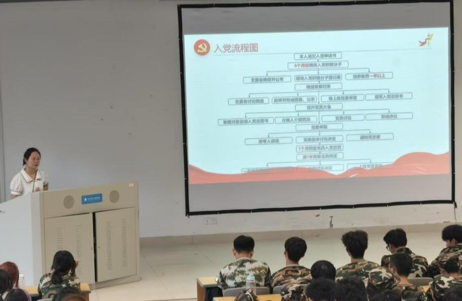 在介绍入党程序时,辅导员们通过清晰的入党流程图,系统讲解了从递交入党申请书到成为正式党员的完整过程,包括确定为入党积极分子、培养教育、政治审查、发展对象确定、预备党员接收与转正等环节,帮助新生对入党流程有了全面而具体的认识。此外,讲座还详细讲解了入党申请书的基本写法,包括格式、内容与注意事项,并明确了入党积极分子的主要条件,如政治立场坚定、学习成绩良好、志愿服务时长达标、无违纪记录等,为有意向入党的同学指明了努力方向。