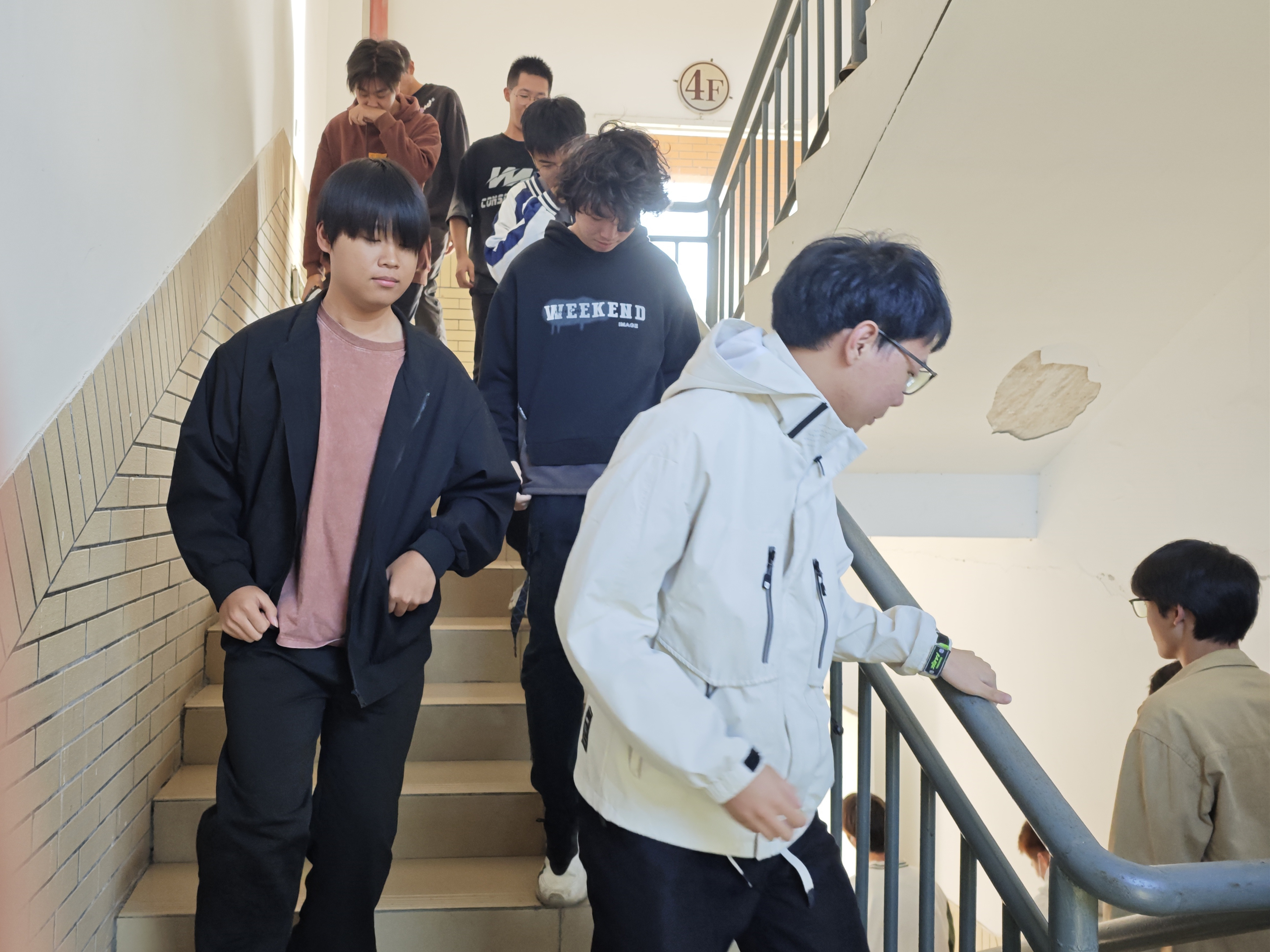 15点整,火警警报信号响起,分布在宿舍楼、教学楼、图书馆、行政楼等区域的应急疏散老师立即启动疏散预案,告知学生火情并指导逃生方法。遇浓烟模拟场景时,同学们捂住口鼻,保持安全距离,有序从安全通道撤离,到达疏散集合点后,各专业辅导员迅速清点人数,确保全员到齐。