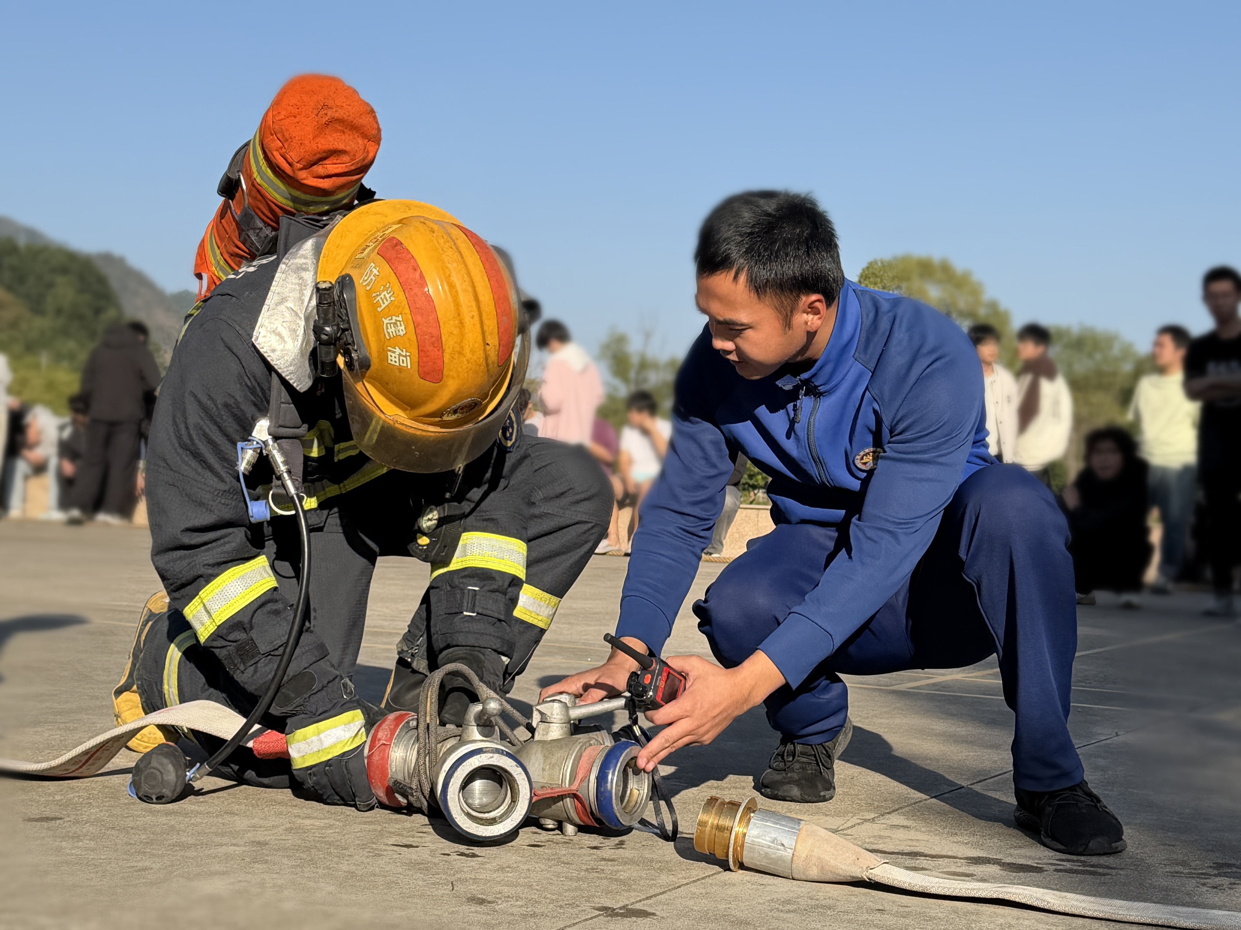随后,仙游消防大队的消防员们带领在场师生体验消防实操项目,让师生们“零距离”感受消防工作。在消防员的指导下,同学们依次体验消防服穿戴、学习消防水带接口对接技巧,并手持消防水枪体验灭火喷射,感受“精准控火”的专业要领。百米负重跑项目中,同学们身着消防服、肩扛消防水带奋力奔跑,在速度与力量的比拼中,真切体会消防员执勤的艰辛。整个实操体验过程井然有序,师生们热情高涨,在实践中夯实了消防安全技能。