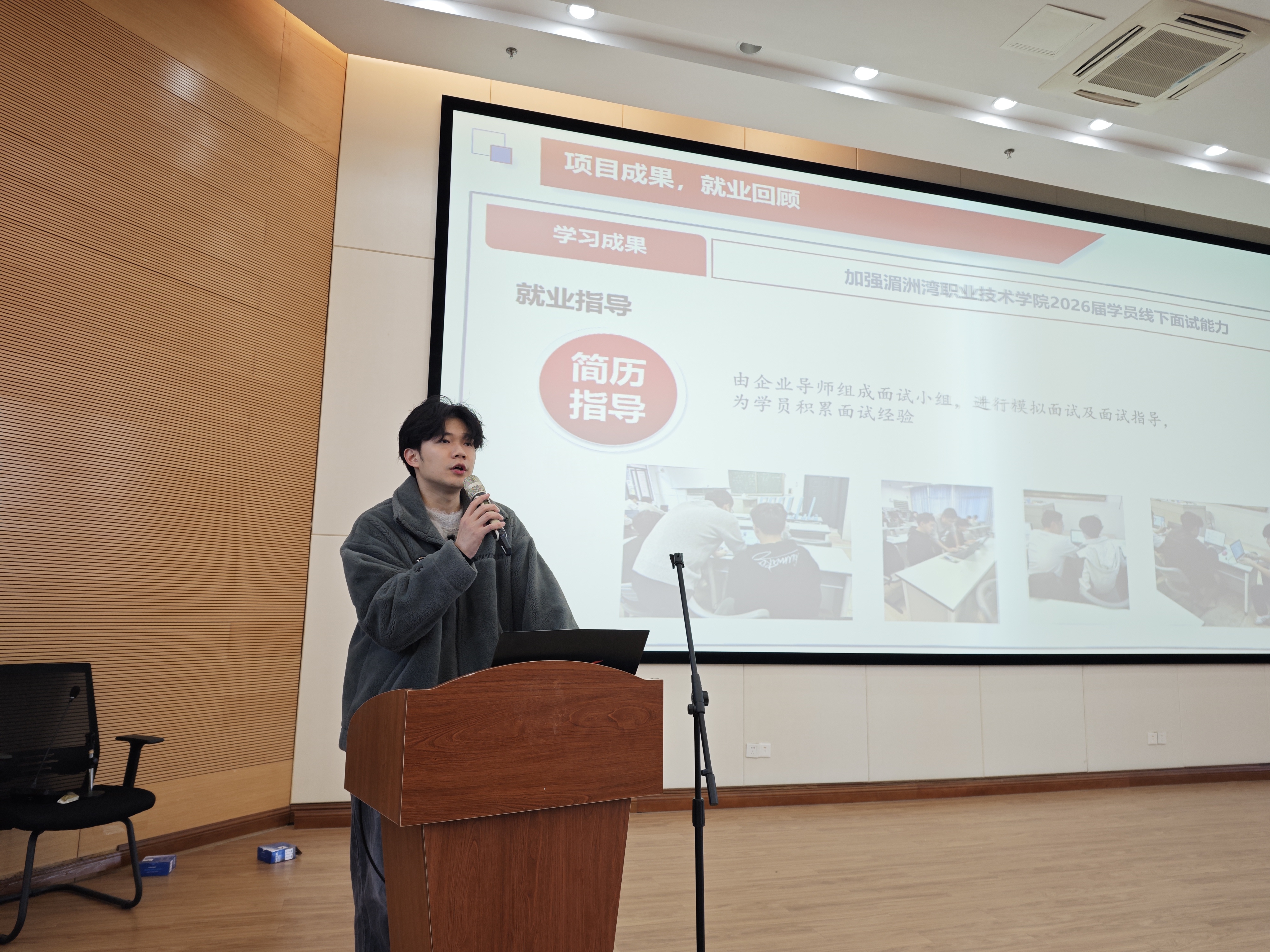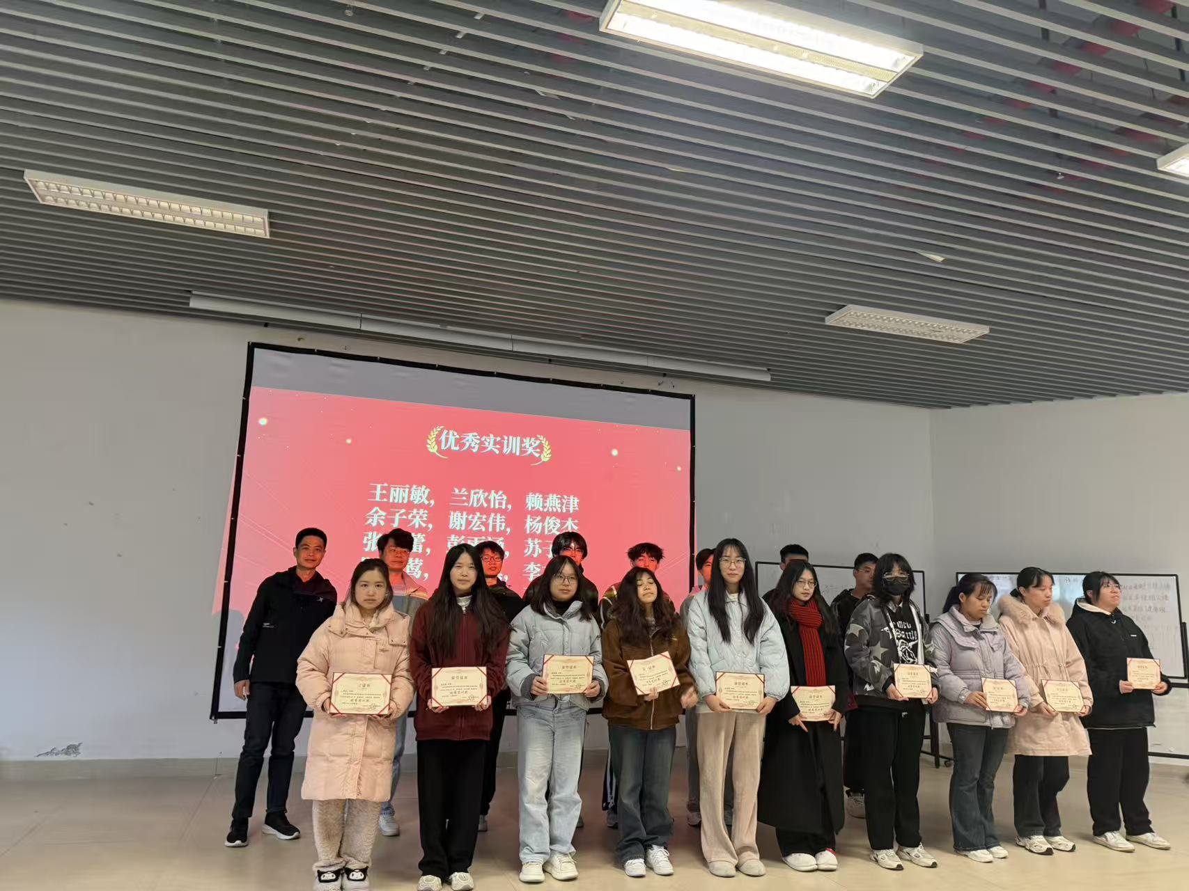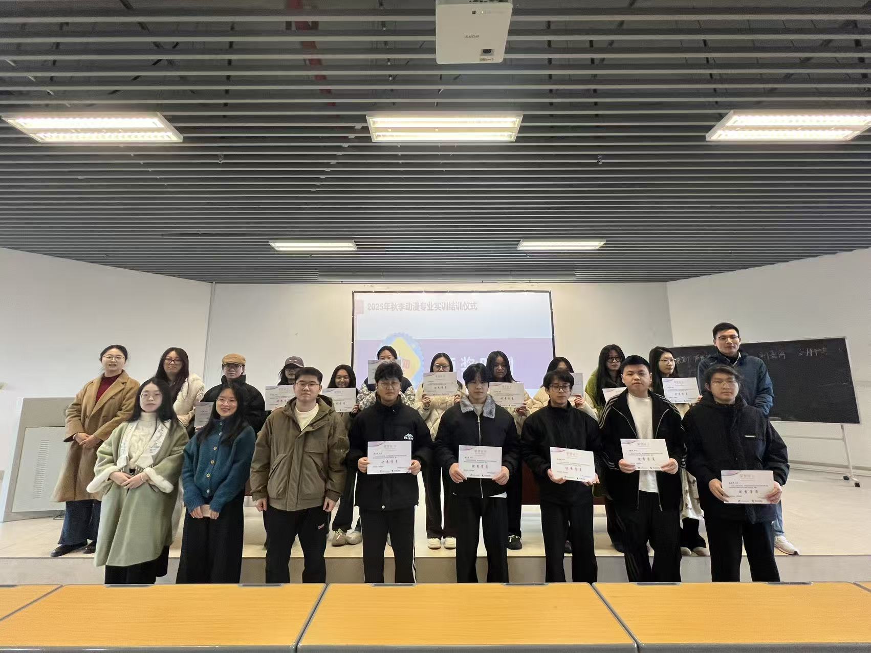 在优秀成果展示环节,各专业学生代表依次上台分享实训成果,充分展现了信息产业学子的专业素养与创新活力。随后,校企双方代表共同为在实训中表现突出、成绩优异的学生颁发荣誉证书,台下学生纷纷报以热烈掌声,向获奖同学表示祝贺。获奖学生表示,四个月的实训让自己真切感受到了行业节奏与职业要求,不仅提升了技术技能,更学会了团队协作与问题解决,这份经历将成为未来职业道路上的宝贵财富。