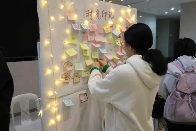 在“时光印记”环节,五彩便签纸化作“时光信笺”。同学们提笔,将2025年的欢笑与遗憾、未尽的期许,化作简短文字或抽象图案——或许是一抹象征希望的绿植线条,或许是藏在角落的小心愿。这些“时光注脚”被匿名贴满墙面,构成一面满载故事的记忆墙,每一张便签都是时光的私语,无声诉说着心灵的轨迹。